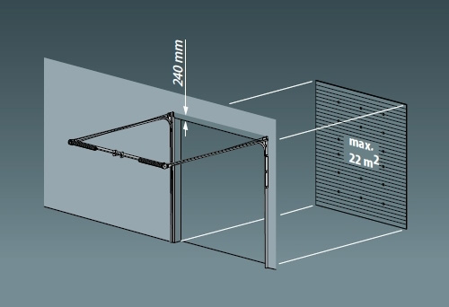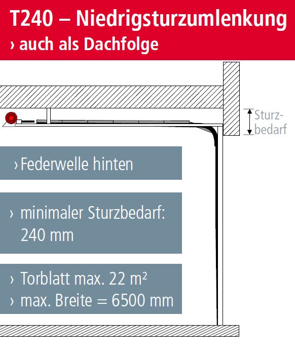 Das T 240-System ist für den Niedrigsturzbereich über der Toröffnung geeignet (240 mm – 330 mm). Zwischen den hinteren Enden der horizontalen Schienen ist ein Viereckrohr montiert. Auf diesem Viereckrohr wird das Federpaket befestigt. Dieses System kann eventuell (nach Rücksprache) auch verwendet werden, wenn die Sturzhöhe weniger als 240 mm beträgt. Im maximalen oberen Endstand bleibt das Sektionaltor dann in der lichten Öffnung sichtbar.