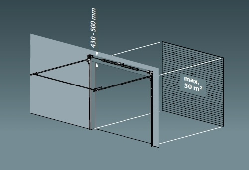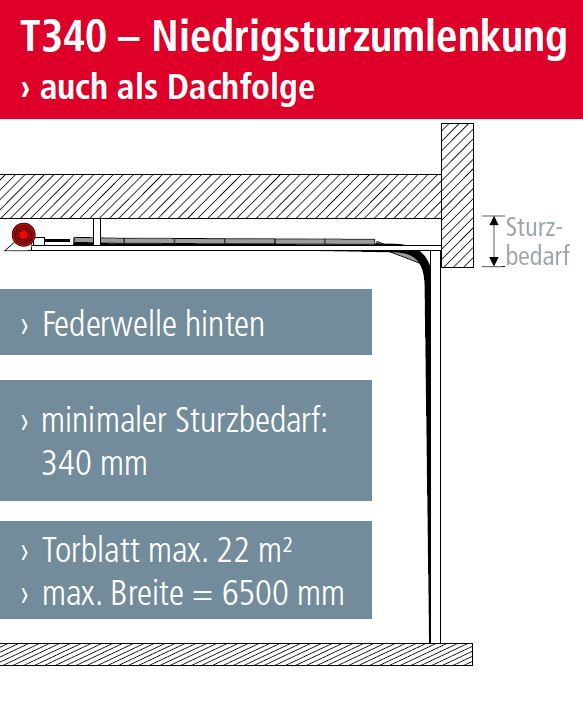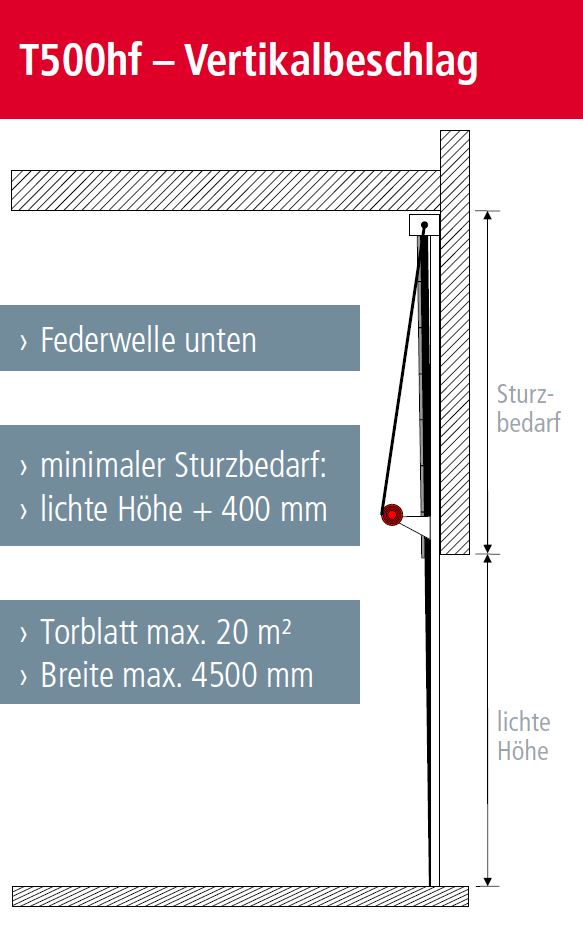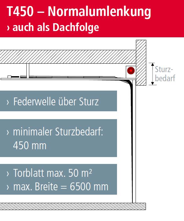 Das T 450-System wird bei einem Freiraum über der Toröffnung von 430 bis 700 mm verwendet. Die Montage des Federpaketes erfolgt über der Toröffnung im Sturzbereich. Dieser Bereich muss zur Aufnahme der dynamischen Last statisch geeignet sein.