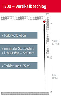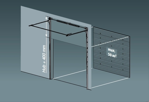 Das T 400-System wird bei einem Freiraum über der Toröffnung von mehr als 700 mm bis 3.400 mm eingesetzt. Das System bietet die Möglichkeit das Torblatt oberhalb der Toröffnung weiter senkrecht zu fahren und die horizontalen Laufschienen möglichst nah zur Hallendecke zu führen. Die Montage des Federpaketes erfolgt im Sturzbereich oberhalb der horizontalen Laufschienen. Dieser Bereich muss zur Aufnahme der dynamischen Last statisch geeignet sein.
