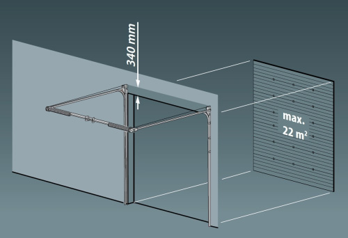 Das T 340-Systen wird bei einem Freiraum von 340 mm bis 420 mm über der Toröffnung eingesetzt. Zwischen den hinteren Enden der horizontalen Schienen ist ein Viereckrohr montiert. Auf diesem Viereckrohr wird das Federpaket befestigt.