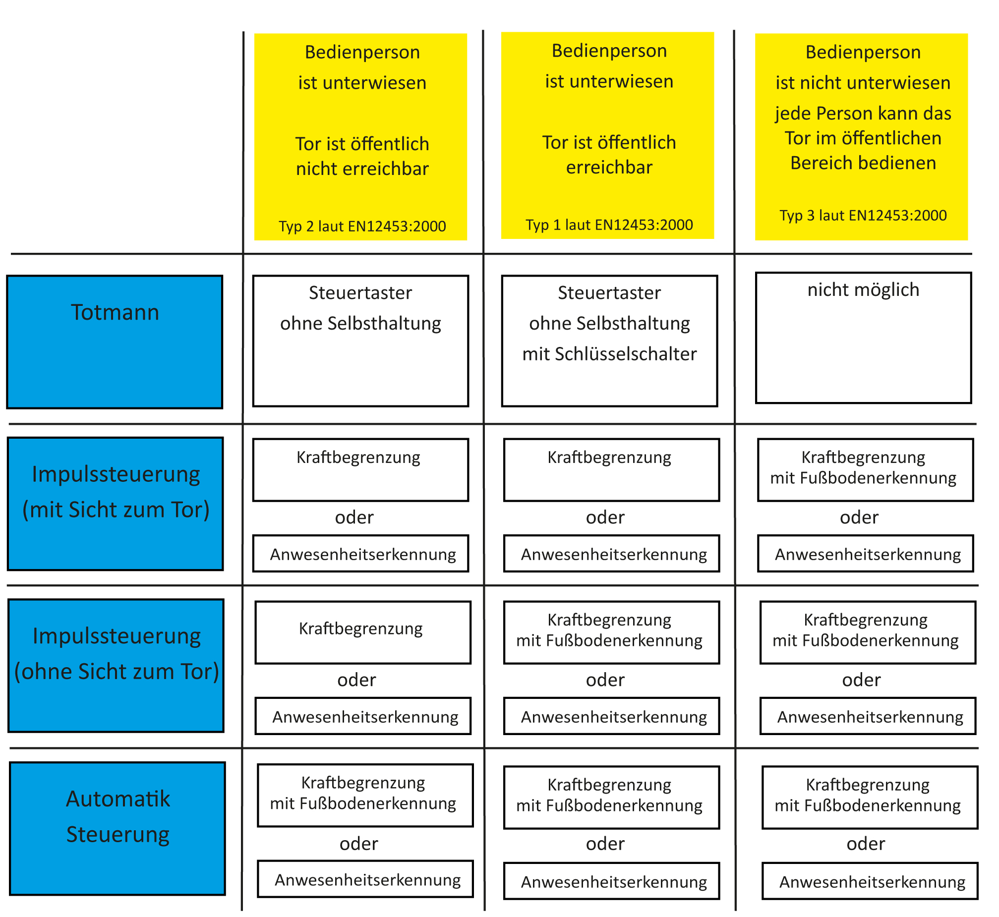 In der EN12453:2000 (zum Stand April 2017 geltende Norm Tore | Nutzungssicherheit kraftbetätigter Tore - Anforderungen) sind unter Punkt 5.5.1 folgende Mindestschutzeinrichtungen an der Hauptschließkante eines Tores festgelegt. Diese sind in Abhängigkeit der eingesetzten Steuerungen und der Art der Bediener unterschiedlich festgelegt. Im Weitern sind die Anforderungen in einer Tabelle dargestellt, die an der Tabelle 1 der EN12453:2000 angelehnt sind.